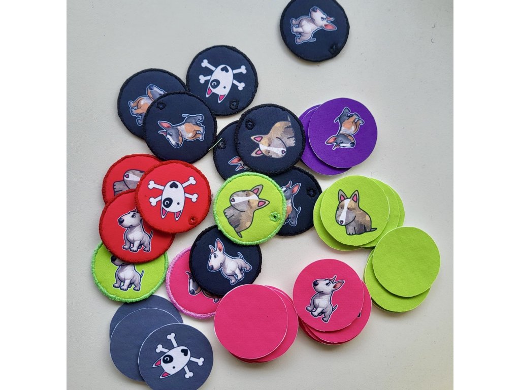 Látkové kolečko s vytištěným jménem bulíka a telefonním číslem z jedné strany a obrázkem podle výběru na straně druhé.