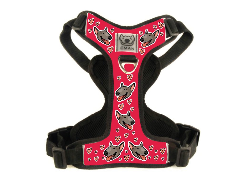 Postroj typu Y neomezuje chůzi a přirozený pohyb psa, je vyroben tak, aby vyhovoval každému standardnímu bulteriérovi.