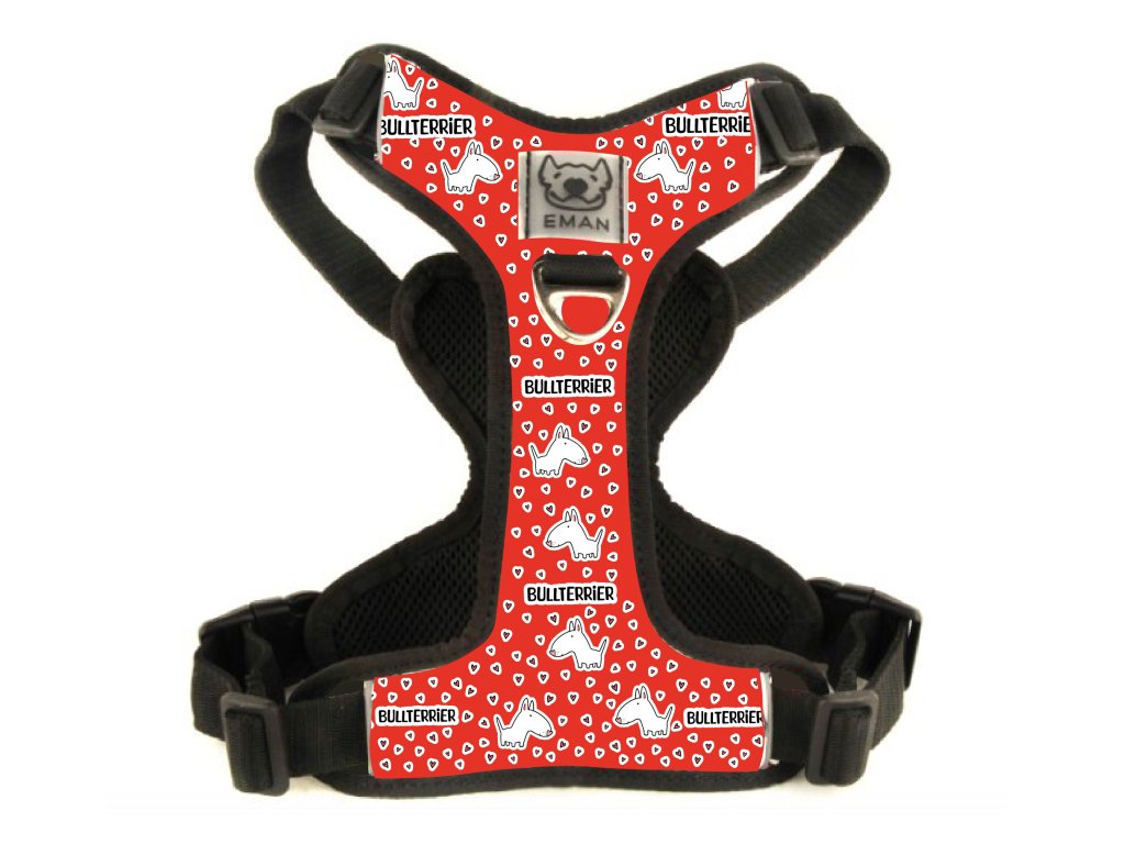 Postroj typu Y neomezuje chůzi a přirozený pohyb psa, je vyroben tak, aby vyhovoval každému standardnímu bulteriérovi.